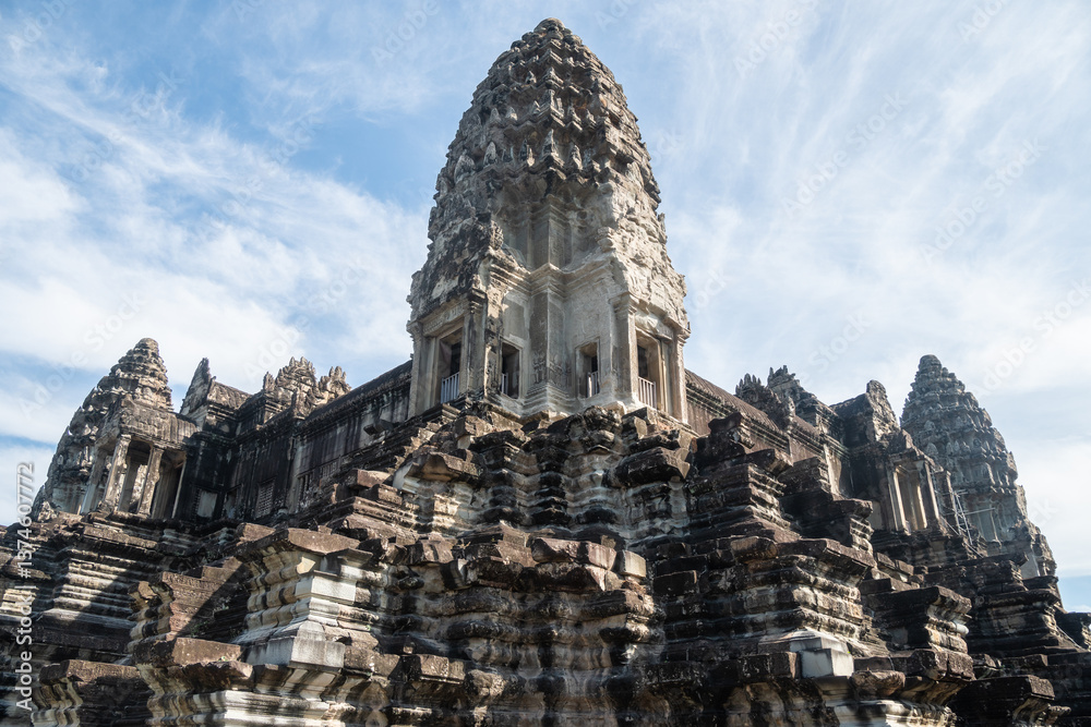 Angkor Wat, A remarkably tall building set against a clear blue sky backdrop