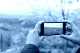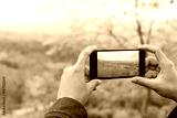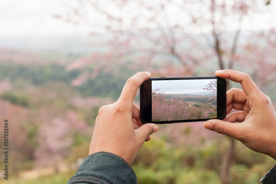 tourist holding phone mobile taking photo cerasoides tree