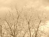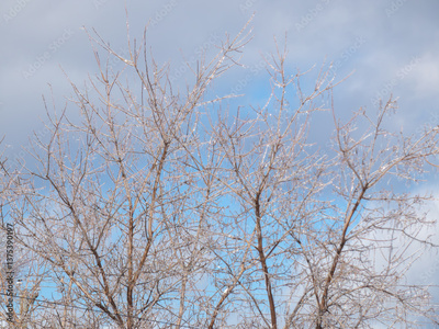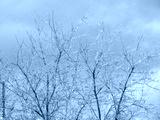 tree branches coated in ice against a cloudy blue sky