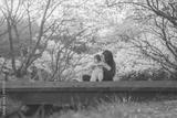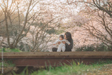 Happy asian toddler baby girl in cute bear outfit playing with mother on wooden bridge surrounded by sakura trees cherry blossoms with sunlight in springtime japan, Family Love Concept