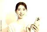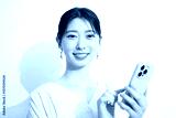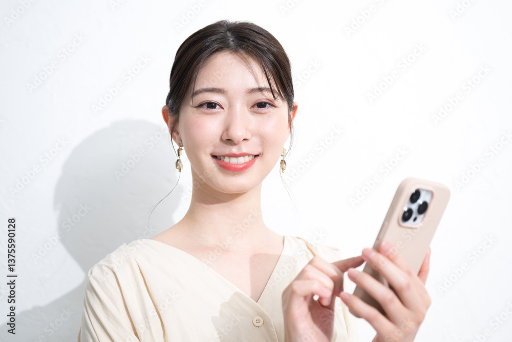白背景でスマホを笑顔でタップする若い女性 カメラ目線