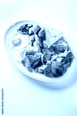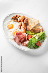 A delectable breakfast plate featuring crispy bacon, sunny-side-up eggs, sautéed mushrooms, fresh salad, and toasted bread, served on a white oval dish.