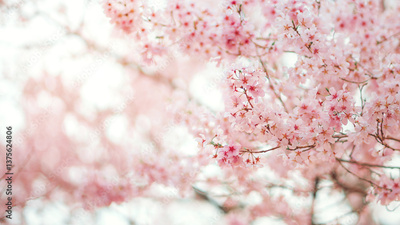 Closeup pink Sakura flowers cherry blossom in full bloom in soft spring light, Sakura blossoming season in Japan, Beautiful nature spring background with a branch of blooming sakura, copy space