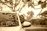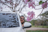 Elderly woman joyfully branch of pink blossoms while standing through car