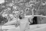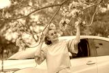 Elderly woman joyfully branch of pink blossoms while standing through car