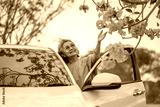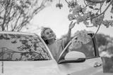 Elderly woman joyfully branch of pink blossoms while standing through car