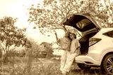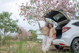 Elderly woman joyfully branch of pink blossoms while standing through car