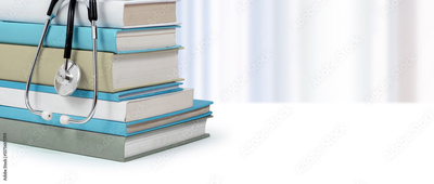 Medical literature concept. Books and stethoscope. Medical students studying.