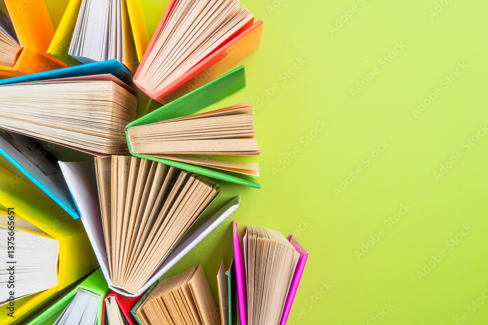Background of books with copy space. Many colorful books. Concept of school library, children's literature, textbooks for teenagers.