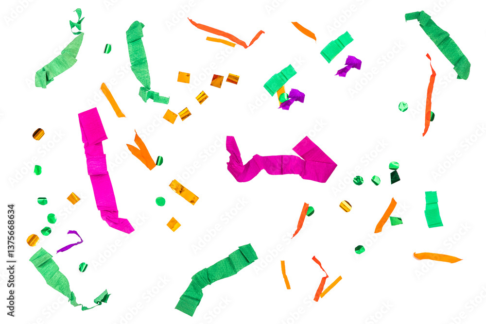 Serpentine, confetti scattered on isolated background. Multicolored circles and ribbons.
