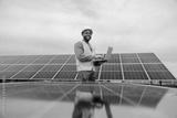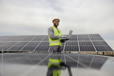 Portrait of diverse technician in coveralls standing at solar farm with laptop in hands surrounded by solar panels.