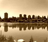 View over Lost Lagoon at old residential high-rises in downtown of Vancouver