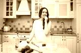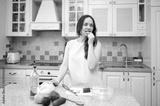Young woman in bright kitchen eating cucumber and preparing salad. Fresh vegetables and ingredients on counter suggest healthy and balanced diet
