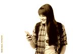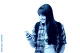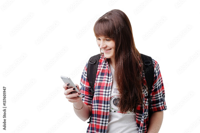 Hipster young woman waiting for someone and using smartphone on white background. Travel vacation getaway trip concept.