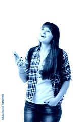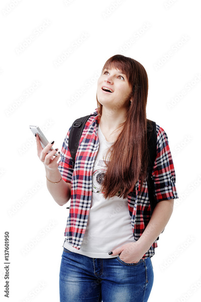 Hipster young woman waiting for someone and using smartphone on white background. Travel vacation getaway trip concept.