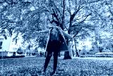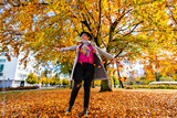 Happy middle aged woman throwing golden leaves in city park on sunny autumn day. Front view
