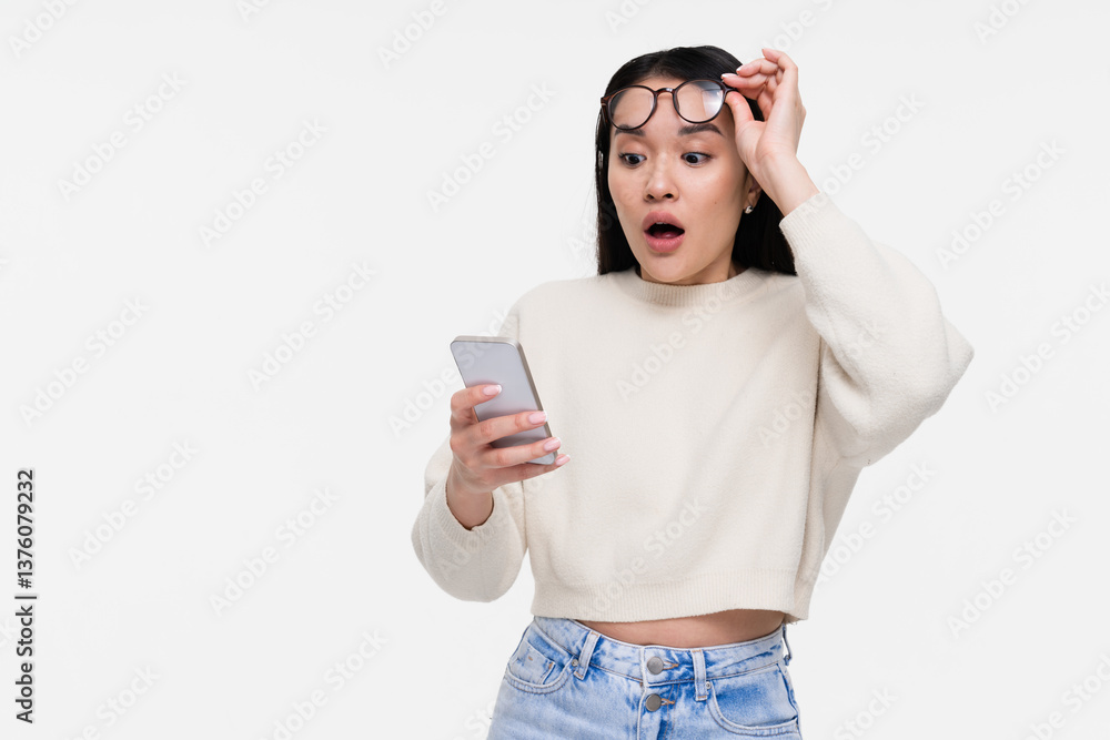 Studio shot of amazed shocked surprised young Asian woman holding and using smartphone, looking at screen touching glasses wow big sale isolated on white background copy space