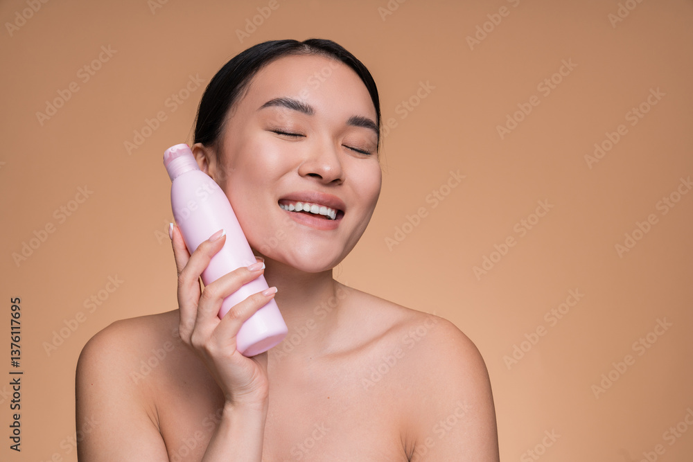 Smiling young Asian woman lady girl closed eyes pointing at beauty treatment bottle product, shower gel hair shampoo face skin care, hydration and rejuvenation isolated in beige background