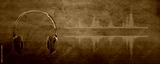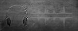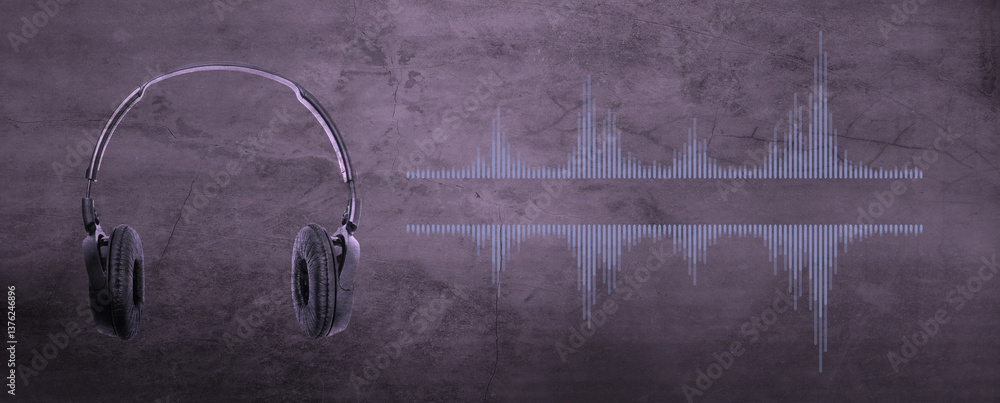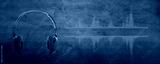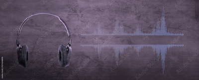 Professional microphone with waveform and headphones on background banner. Podcast or recording studio background