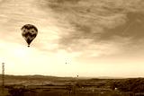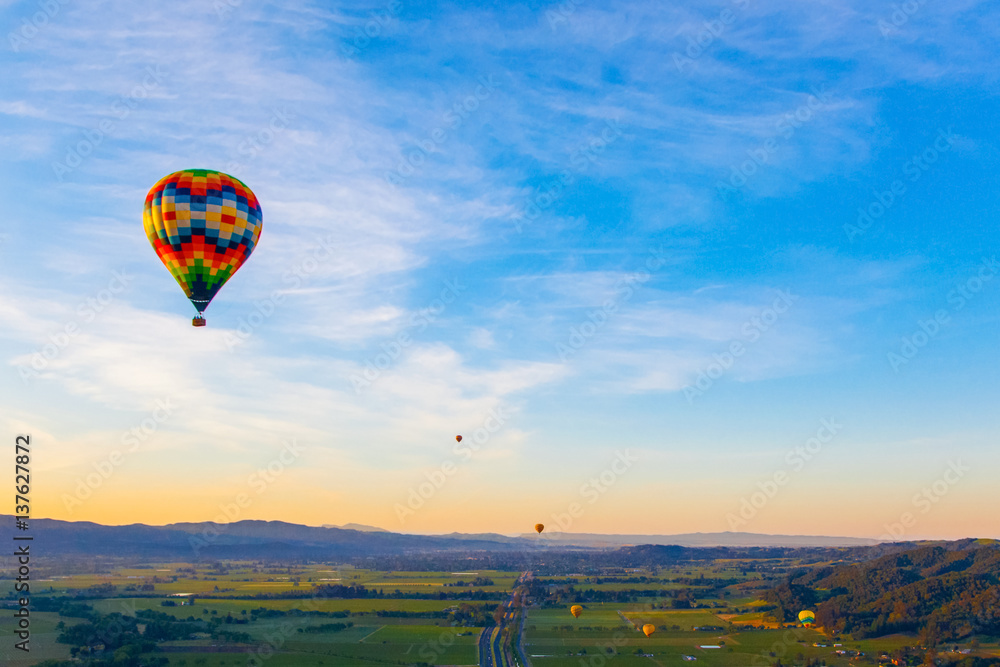 Hot Air Balloon Over Vineyards At Sunrise Over Napa Valley, Napa, California USA