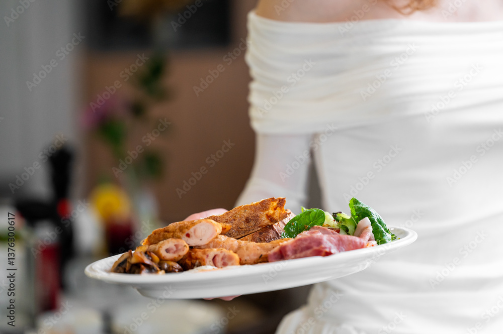 A person in a white dress elegantly holds a plate filled with a delicious meal of sausages, crispy bacon, fresh greens, and mushrooms. The blurred background features flowers and tableware
