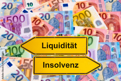 Ein Wegweiser ist beschriftet mit Liquidität und Insolvenz über vielen Euro Banknoten - FOTOMONTAGE
