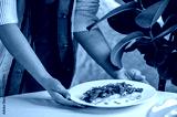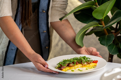 A freshly prepared omelette garnished with arugula, crispy bacon, and cherry tomatoes is being served on a white plate. The setting exudes a warm and natural ambiance with subtle greenery in the backg