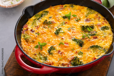 Broccoli, bacon and cheese frittata in a cast iron pan, healthy breakfast idea