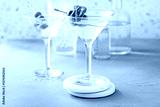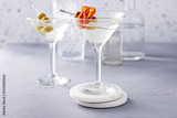 Classic martini cocktail garnished with olives and salami slice