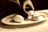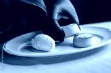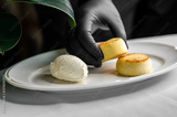 A gloved hand places a golden-brown cheese pancake on a white plate with cream cheese. Set on a white tablecloth, with a green leaf in the background, highlighting gourmet presentation.