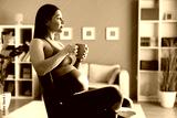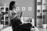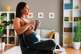Pregnant woman sitting on a chair holding a cup of tea and looking away, relaxing at home