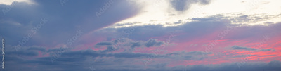Dusk, Sunset Sky Clouds in the Evening with colorful Orange, Yellow, Pink and red sunlight and Dramatic storm clouds on Twilight sky, Landscape horizon Golden sky nature Summer Background