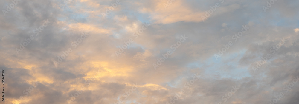 Dusk, Sunset Sky Clouds in the Evening with colorful Orange, Yellow, Pink and red sunlight and Dramatic storm clouds on Twilight sky, Landscape horizon Golden sky nature Summer Background