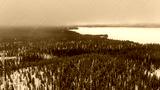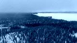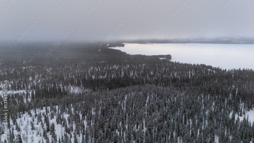 Aerial top down view of snowcapped trees in winter in Lapland, Finland.