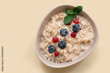 Bowl with tasty oatmeal, chia seeds and berries on beige background