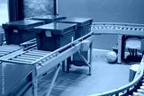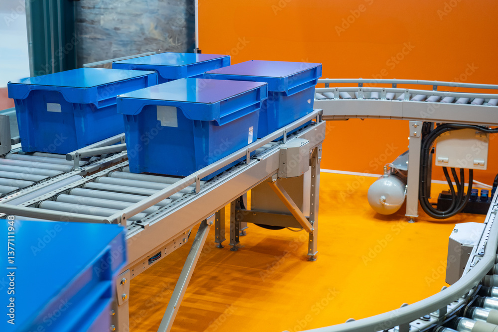 Conveyor line in factory. Blue plastic boxes on production line. Conveyor belt inside orange workshop. Automation production process. Closed containers inside automated workshop. Roller conveyor belt