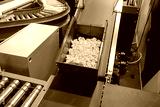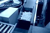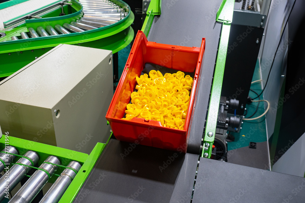 Conveyor belt in production. In container with yellow plastic parts. Production belt for moving products around factory. Conveyor belt top view. Production line at industrial plant.