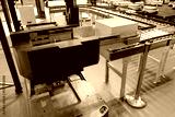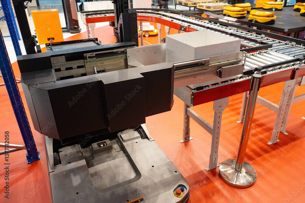 Automation of warehouse fulfillment. Conveyor equipment. Warehouse robot near production line. Platform for moving goods onto conveyor. Automated warehouse robot. Robotization of fulfillment business
