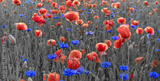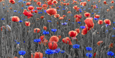 Wild poppies field in the evening light, panorama-black and white version