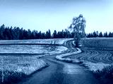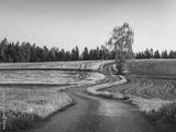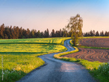 Winding dirt road through rural landscape with plowed field, meadow and forest, Bavaria, Germany