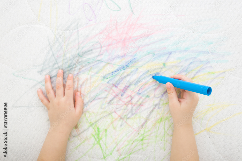 Baby hand holding marker and drawing colorful scratches lines on white mattress cloth. Closeup. Draw of naughty little kid. Point of view shot. Top down view.