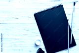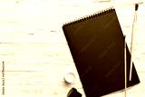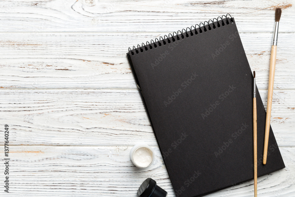 Album pages and paints, pencils, brush on a colored background. Top view with empty space. workplace for creativity. home teaching concept drawing