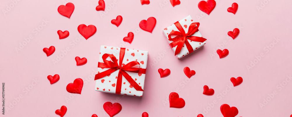 Valentine day composition Background: red gift box with bow and heart. Christmas present. View from above. Holday greeting card
