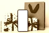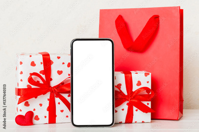 mobile phone with blank screen on colored background with hearts, calendar and gift box, valentine day concept perspertive view flat lay