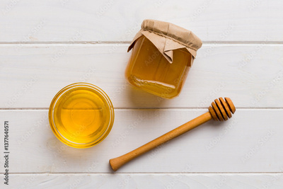 Glass jar of honey with wooden drizzler on colored background. Honey pot and dipper high above. Top view copy space
