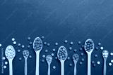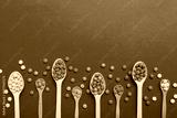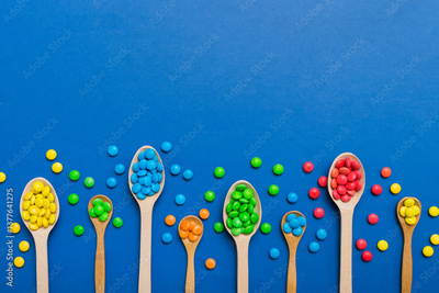 delicious colorful sweet candies on spoon on colored background . Confectionery decor top view with copy space