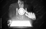Image of a man with tablet in his hands and food restaurant icon. He looking menus, ordering food delivery, rate restaurant with using online services.