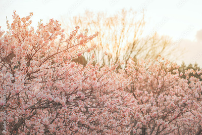 Beautiful and cute pink sakura cherry blossom against blue sky with sunlight morning, in spring, Japan