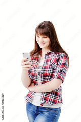 attractive brunette in jeans and a plaid shirt In Use your mobile phone