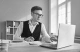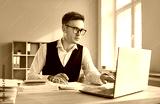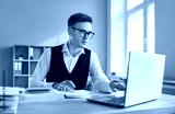 Portrait of young attractive business man accountant working at the desk with a pile of financial documents on his workplace looking at the laptop monitor screen at the office and typing.